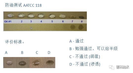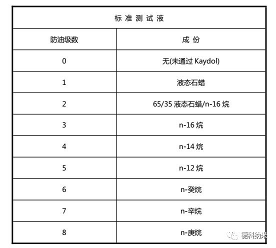 在测试布板上滴一滴标准测试液(一系列不同表面张力的碳氢化合物),然后观察其润湿、毛效情况和接触角。防油级数为没有润湿测试布板的最高级标准测试液的级数。